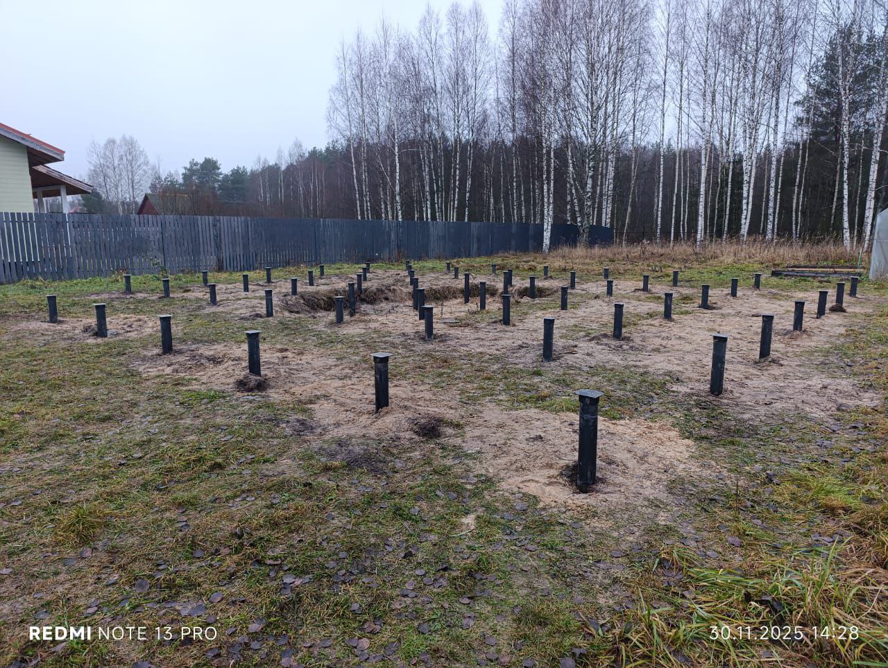 • Выравнивание: Все сваи были обрезаны до единого горизонтального уровня. Этот этап необходим для создания идеально ровной плоскости для дальнейшего строительства дома.