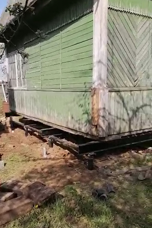 Процесс работы - подъем дома на винтовые сваи. У дома покосился фундамент и владельцы решили заменить его на свайно-винтовой.